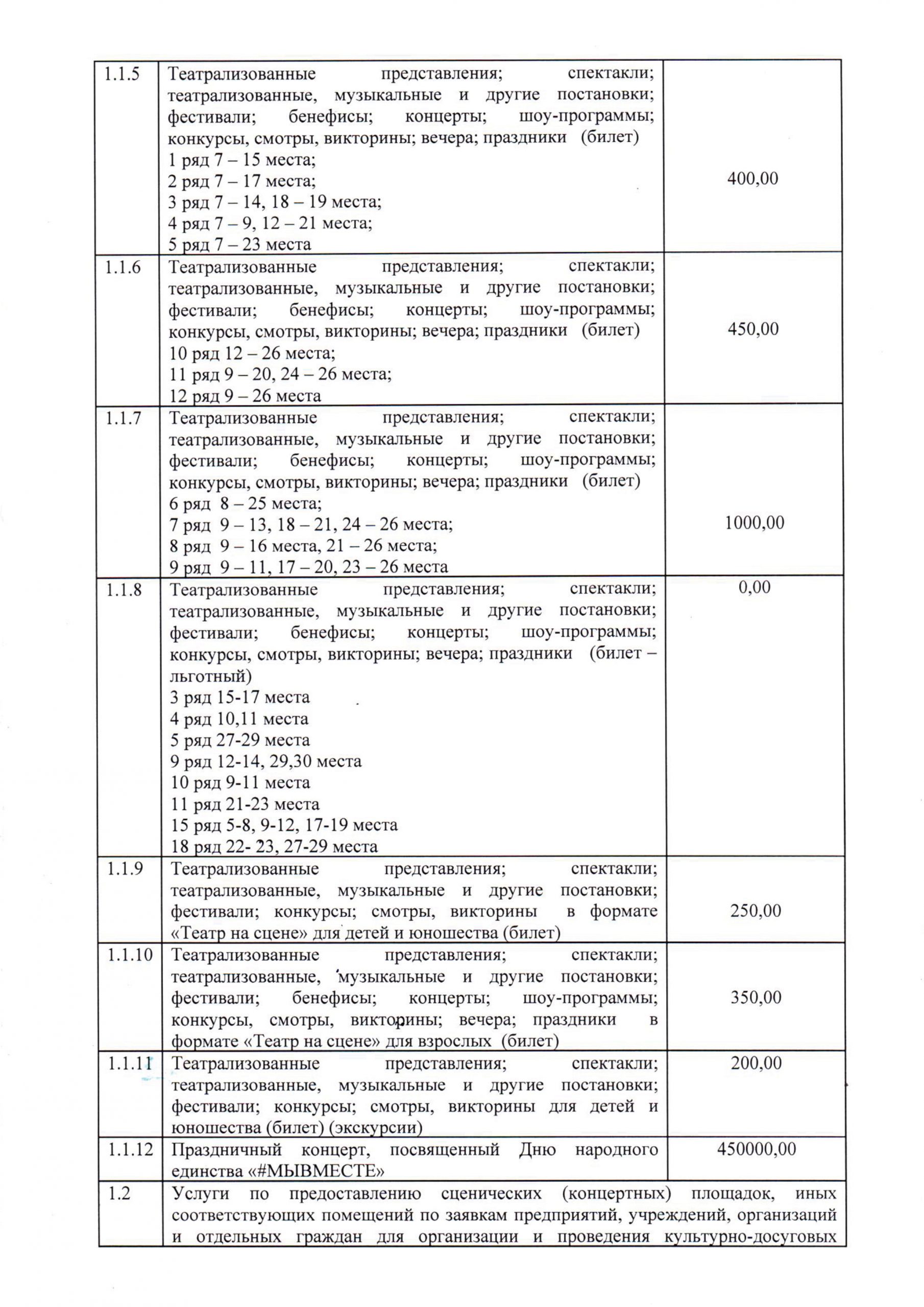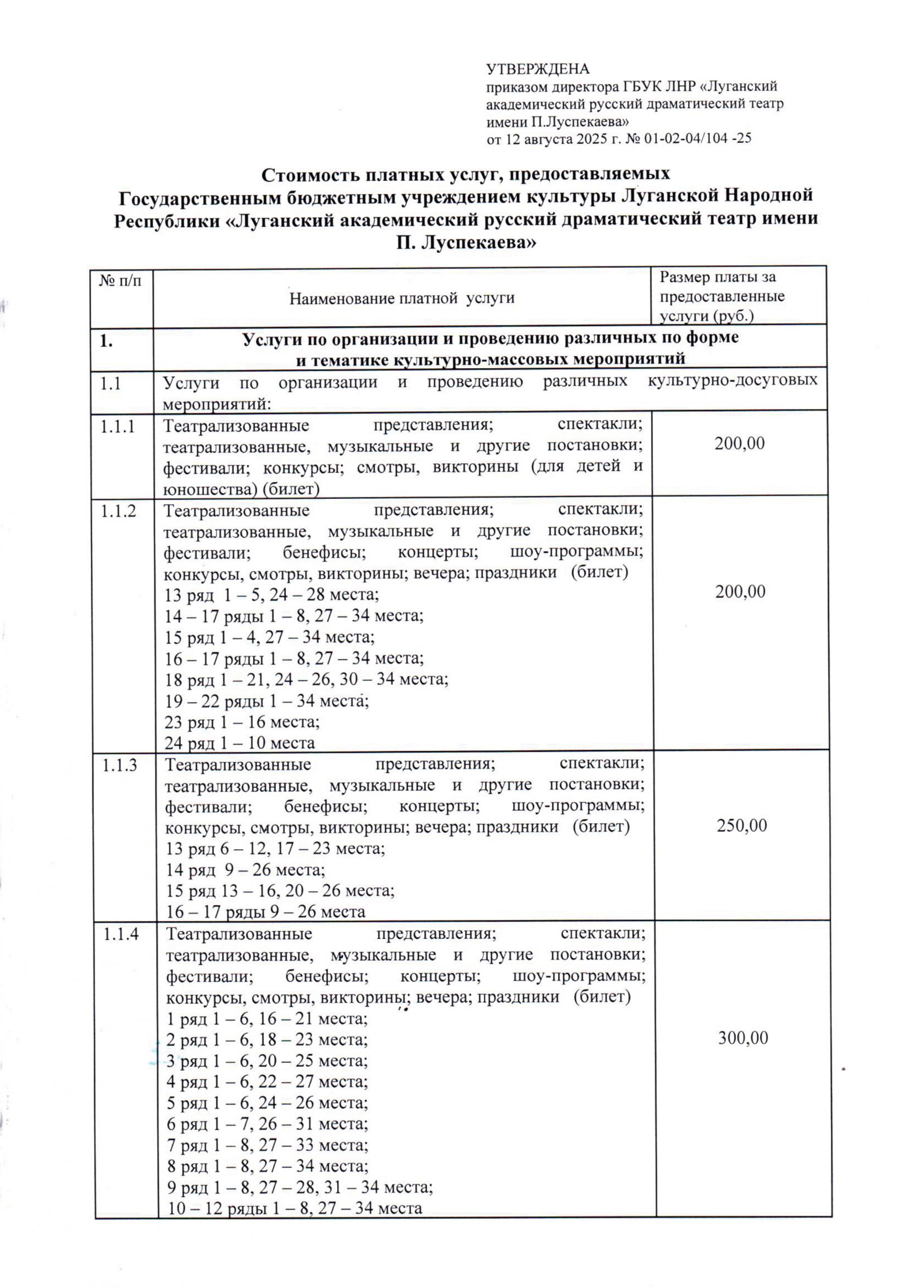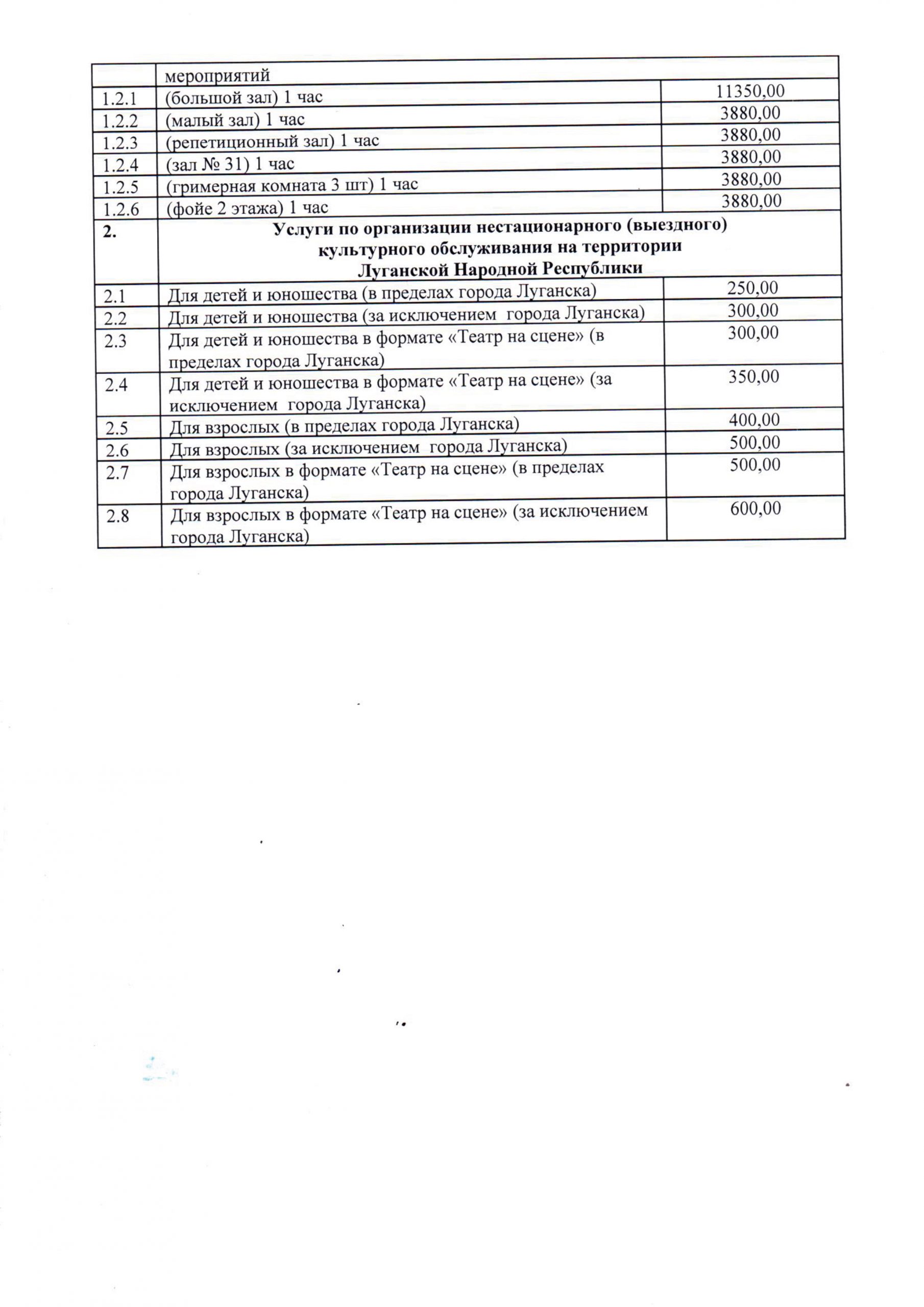 Стоимость платных услуг, предоставляемых Государственным бюджетным учреждением культуры Луганской Народной Республики «Луганский академический русский драматический театр имени П. Луспекаева»